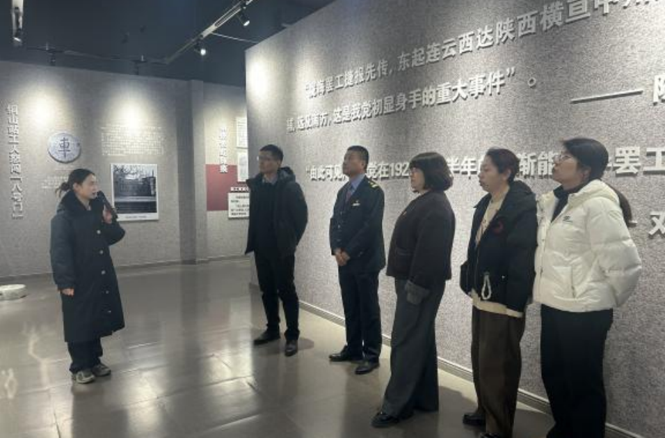 在讲解员的引导下,师生们走进青砖斑驳的八号门事件旧址,这里也是江苏省第一个党支部。通过展出的珍贵历史照片和文献档案,大家深入了解了1921年铁路工人为反抗压迫发起的罢工斗争——这一事件被视为中国共产党领导早期工人运动的重要实践。