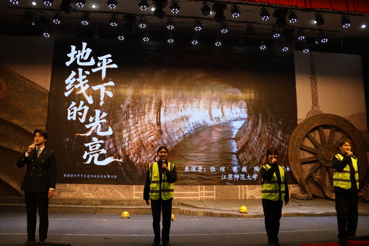 作品《地平线下的光亮》由学院曹云龙老师指导,其故事原型为全国学雷锋活动示范点徐州下水道四班,作品以鲜活的故事、真挚的情感再现了一代代下水道工人“宁可脏一人 服务千万家”的坚毅信念,歌颂了他们无私奉献、坚守初心、崇德向善的时代精神,也生动诠释了青年一代对文明风尚的理解与追求,深深打动了评委与观众。