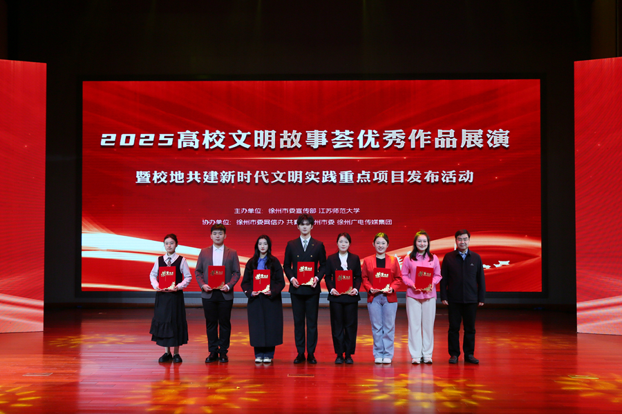 近日,由徐州市委宣传部、徐州市委网信办、共青团徐州市委、徐州广电传媒集团联合主办的2025年“好人好事好彭城·青年青春话文明”徐州高校故事荟活动圆满落下帷幕。我院梁薇、翁嘉妍、陶锡靖、张瑄四名同学表演的作品《地平线下的光亮》斩获团队赛一等奖,并受邀登上“2025高校文明故事荟优秀作品展演”的舞台,充分展现了语科学子昂扬向上的精神风貌。